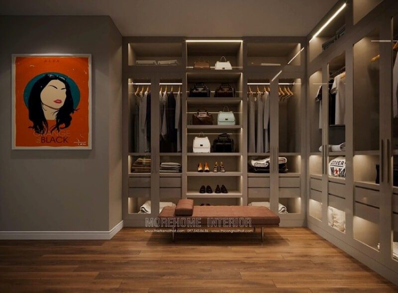 Ấn tượng với không gian hiện đại từ tủ quần áo gỗ acrylic sáng bóng.