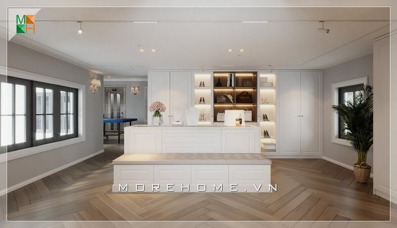 Với một căn biệt thự, nhà phố cao cấp được thiết kế một không gian để đồ rộng rãi tiện lợi với nội thất màu trắng trẻ trung thu hút.
