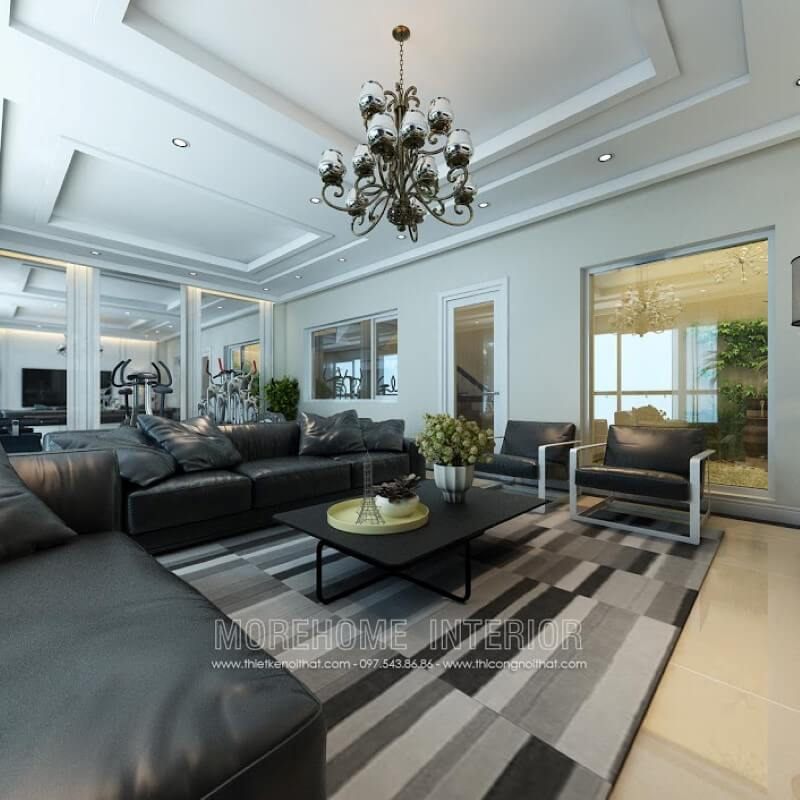 Thiết kế nội thất phòng khách ấn tượng, thay vì sử dụng vách tường đơn điệu như truyền thống, KTS lựa chọn sử dụng vách kính cường lực tạo sự thoáng đãng, năng động hơn cho cả không gian