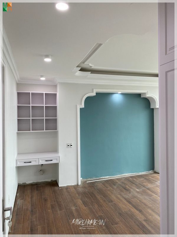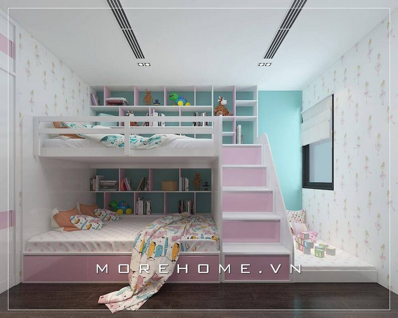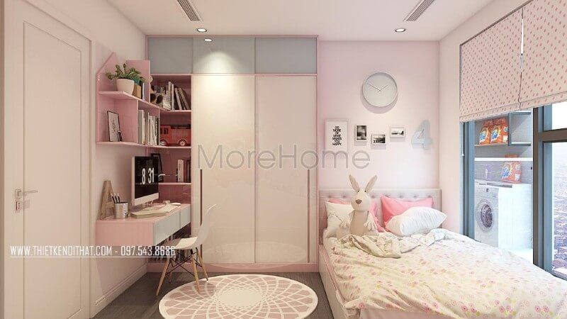 Mẫu nội thất phòng ngủ này sử dụng chất liệu gỗ công nghiệp chủ đạo, kết hợp điểm nhấn màu hồng - xanh nhẹ nhàng đúng như sở thích của bé gái