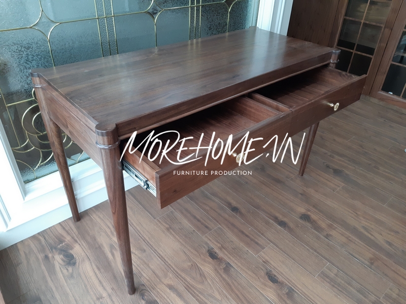 Thi công bàn gỗ tự nhiên tỉ mỉ từng đường nét, có ngăn kéo tiện lợi cho sử dụng, thẩm mỹ cao cho không gian