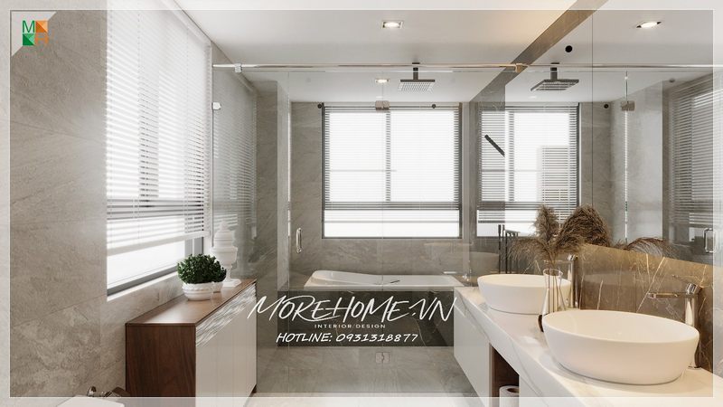 Mẫu phòng tắm hiện đại bố trí tới 2 lavabo rửa mặt và tủ đựng đồ tiện lợi cho những phút giây thư giãn sảng khoái