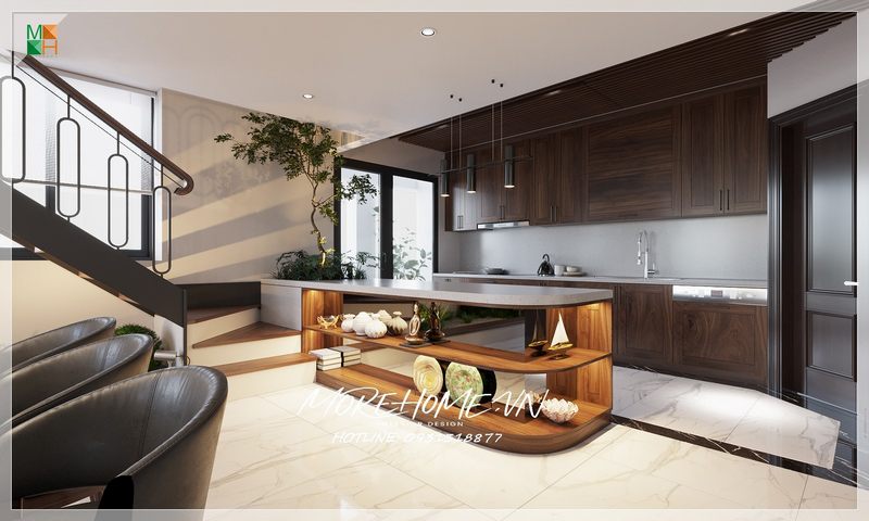 Mẫu bàn đảo bếp mặt đá nhân tạo kèm kệ trang trí gỗ tự nhiên mang đến sự phá cách trong thiết kế để không gian bếp của bạn không còn sự nhàm chán, giúp bạn luôn tìm được niềm hứng khởi trong mỗi bữa cơm cho gia đình