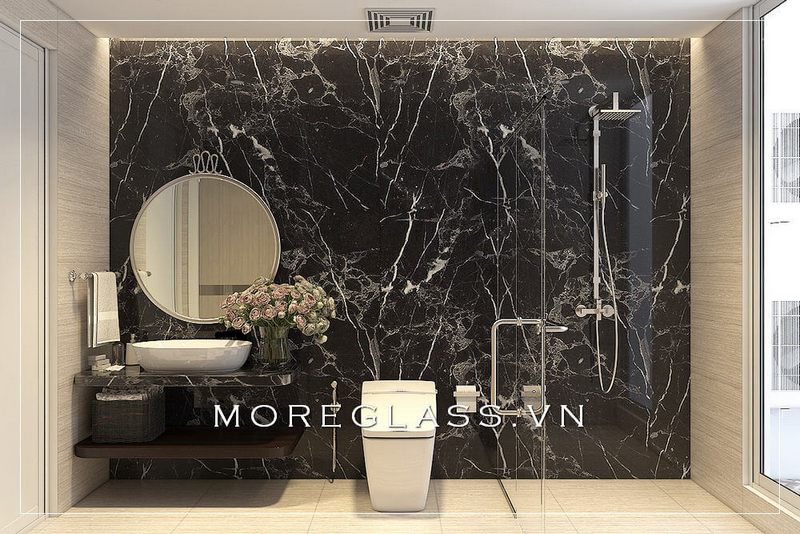 Kiểu dáng hiện đại của phòng tắm chung cư được tạo nên bởi việc sử dụng đá ốp tường vân mây màu sáng, giúp không gian phòng tắm trở nên rộng rãi và sang trọng hơn.