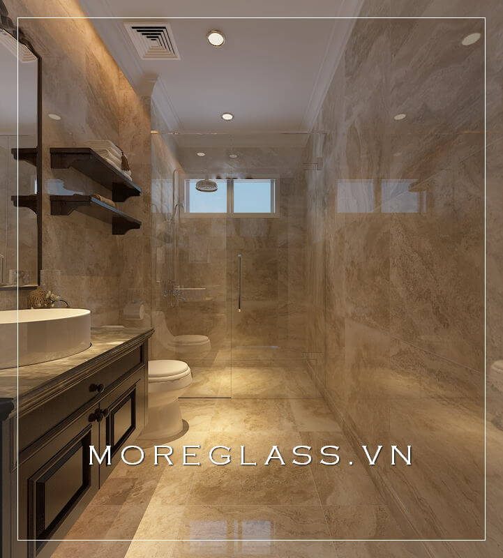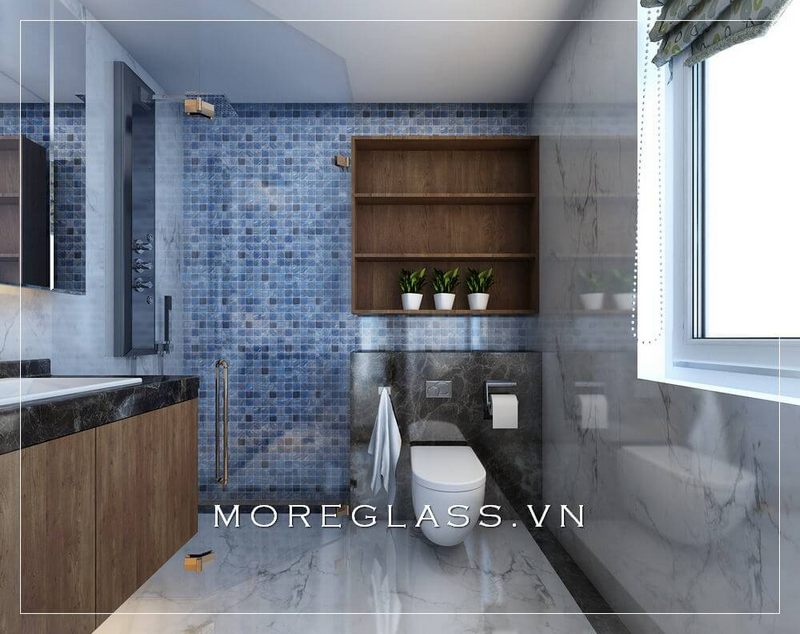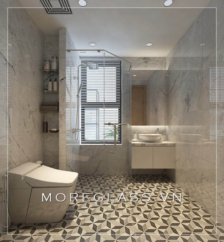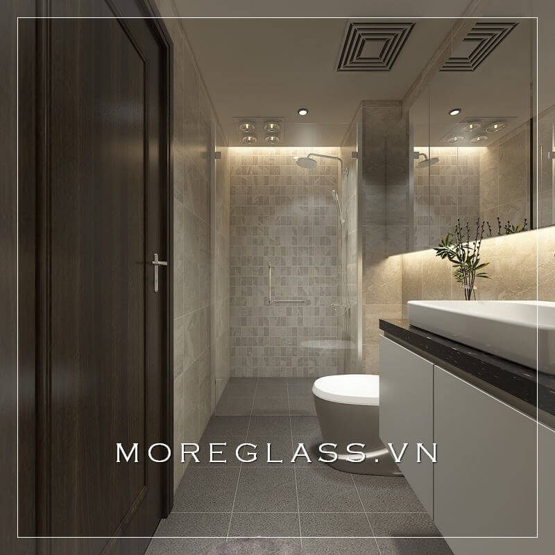 Phòng tắm chung cư được trang trí với các thiết bị vệ sinh hiện đại, bao gồm các gương trang trí, đá ốp tường và vách tắm kính.