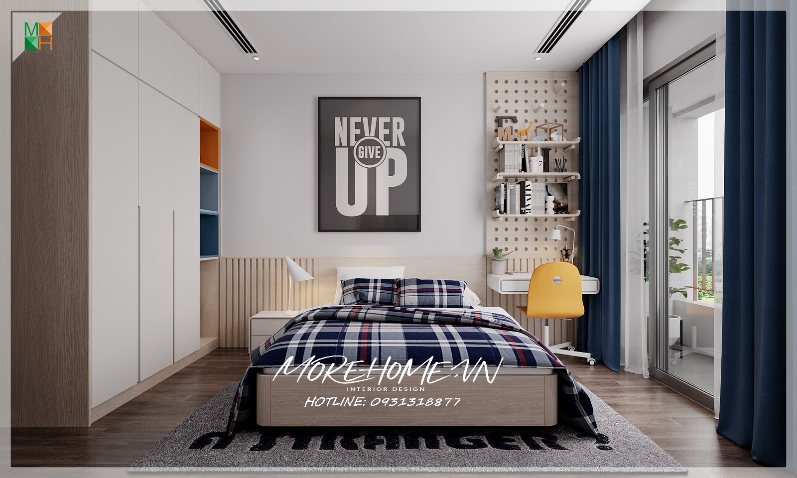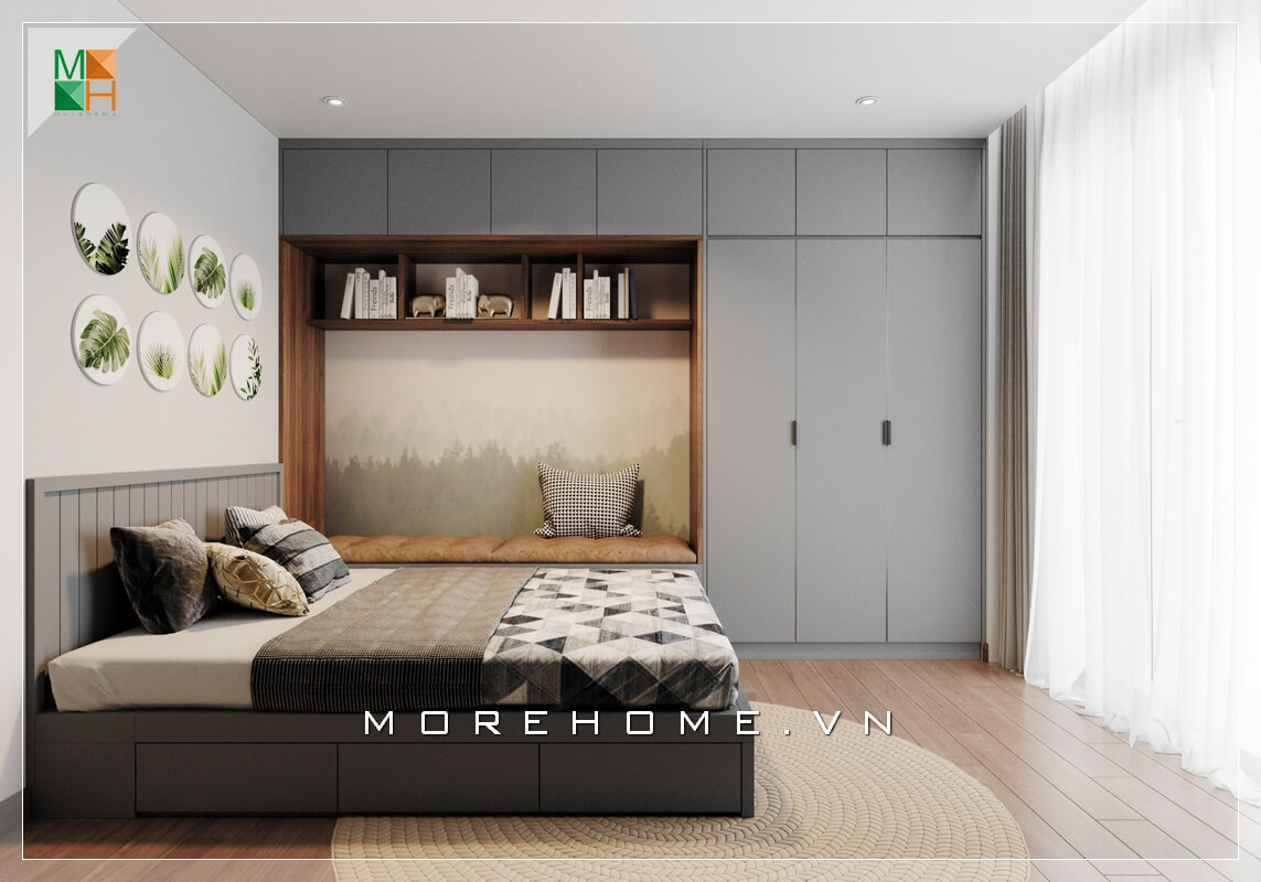 Phòng ngủ được thiết kế theo phong cách Nhật, với tủ gỗ công nghiệp kịch trần cánh lùa vừa tiện lợi mà vẫn tiết kiệm không gian sử dụng, kết hợp giường ngủ gỗ công nghiệp bọc nệm nỉ đầu giường, tạo sự thoải mái cho bạn khi sinh hoạt và nghỉ ngơi